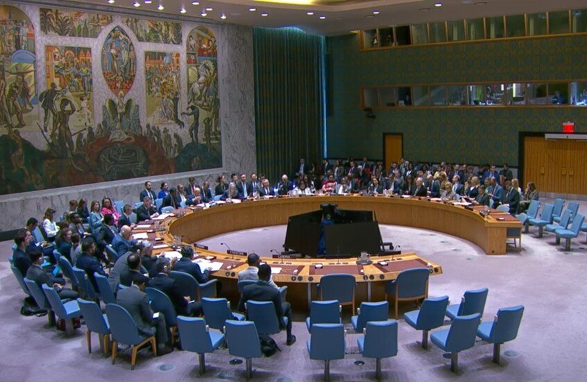 واجتمع مجلس الأمن الدولي في الحادية عشرة صباحاً بتوقيت نيويورك، حيث صوت على مشروع قرار مقدم من البحرين والأردن والإمارات العربية المتحدة وقطر والكويت والمملكة العربية السعودية، بشأن مضيق هرمز.