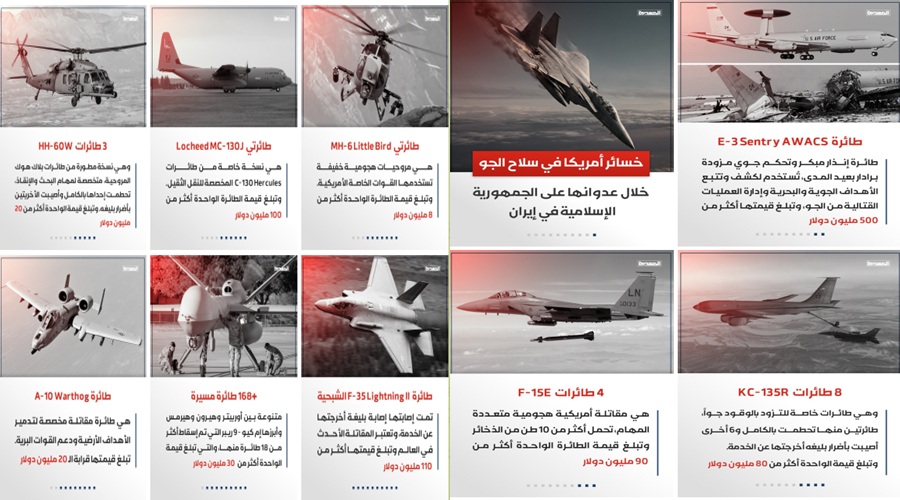 وفي تفاصيل الخسائر في المقاتلات والمنظومات الإستراتيجية؛ أكّدت البيانات على تصدّر طائرة الإنذار المبكر (E-3 Sentry AWACS) قائمة الخسائر، وهي المنظومة المخصصة لإدارة العمليات القتالية والتي تتجاوز قيمتها 500 مليون دولار.