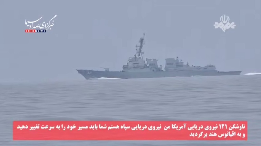 بث التلفزيون الإيراني اليوم مشاهد توثق فشل محاولة عبور مدمرتين أمريكيتين لمضيق هرمز، حيث انسحبت القطع الحربية الأمريكية عقب توجيه إنذار مباشر من قبل القوات البحرية الإيرانية.