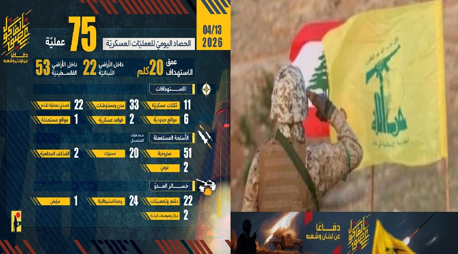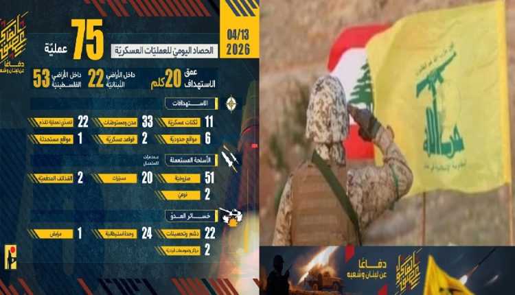 إلى ذلك، ووفقًا لبيانات الحصاد اليومي للعمليات العسكرية، ليوم أمس الاثنين؛ فقد بلغ إجمالي عدد العمليات “75 عملية” جهادية، توزعت على نطاق وجغرافيا الاستهداف، ما بين داخل الأراضي اللبنانية بـ “22 عملية”، وعمق الاستهداف حتى 20 كلم داخل الأراضي الفلسطينية المحتلة بـ “53 عملية”.