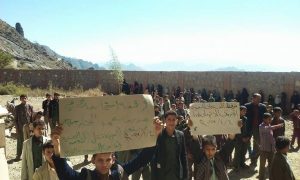 تحت شعار “أمريكا تقتل الشعب اليمني”, نفذ معلمي وطلاب وطالبات مدرسة عمرالمختار بسهله جعيد بمديرية عتمة, وقفة احتجاجية صباح اليوم الاربعاء, دان فيها المشاركين استمرار العدوان السعودي الامريكي على اليمن.