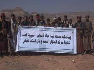 تواصلا للحراك الشعبي والقبلي نفذ أبناء قبائل الاعماس بمديريه الحداء محافظة ذمار وقفه استنكاريه لجرائم العدوان الأمريكي السعودي.