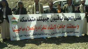 نظم أبناء مديرية جبل الشرق بمحافظة ذمار صباح اليوم الثلاثاء وقفة احتجاجية ضد العدوان المستمر الغاشم في قصف المواطنين الابرياء وتضامنا مع قبيلة أرحب تجاه مع تعرضت له النساء المعزيات بقصف طيران التحالف المنحط .