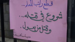 ورفع معلمو وطلاب كلا المدرستين عدد من اللوحات الفنية والتي تحمل في طياتها رسائل قوية باللغات العربية والإنجليزية لتوصيل رسالة قوية إلى العالم ككل بوقف العدوان …والمطالبة بصرف الرواتب بأسرع وقت ممكن عبر الطلاب والطالبات عما يجيش في خواطرهم