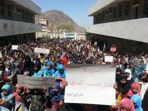 وفي الوقفة رفع الطلاب والطالبات الشعارات والعبارات المعبرة عن الغضب الشعبي إزاء سياسية الحصار والتجويع وقطع المرتبات التي يمارسها العدوان بإيعاز أممي ودولي.
