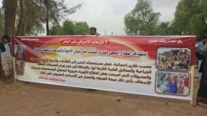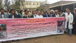 وندد المشاركون في الوقفة بإستمرار العدوان وما يرتكبه من جرائم بشعة بحق أبناء الشعب اليمني والبنية التحتية بما فيها المنشآت الصحية، وكذا إستمرار الحصار والذي منع دخول الأدوية والمستلزمات الطبية وخاصة في ظل إنتشار الأمراض والأوبئة ومنها الكوليرا.