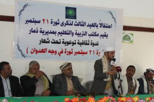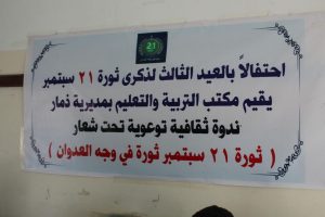 نظم مكتب التربية والتعليم بمديرية ذمار صباح اليوم الاحد ندوه ثقافية توعويه تحت شعار” ثورة 21سبتمبر ثورة في وجهه العدوان”, وذلك احتفالأ بالعيد الثالث لذكرى ثورة 21سبتمبر.